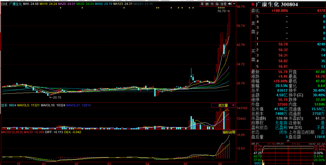 6月9日,广康生化(300804.SZ)再次20CM涨停,至此,其股价从5月26日的26.53元起步,九个交日易股价不仅翻倍,同时创出了历史新高。
