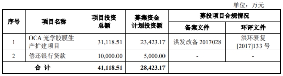 斯迪克发行的募集资金总额为32,919.67万元,扣除本次发行的发行费用4,496.50万元后,募集资金净额为28,423.17万元。斯迪克2019年11月12日发布的招股说明书显示,公司拟将募集资金用于OCA光学胶膜生产扩建项目、偿还银行贷款。