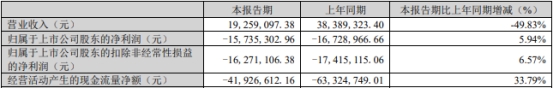 2023年一季度报告显示,报告期内,公司实现营业收入1925.91万元,同比减少49.83%;归属于上市公司股东的净利润为-1573.53万元,上年同期为-1672.90万元;归属于上市公司股东的扣除非经常性损益的净利润为-1627.11万元,上年同期为-1741.51万元;经营活动产生的现金流量净额为-4192.66万元,上年同期为-6332.47万元。