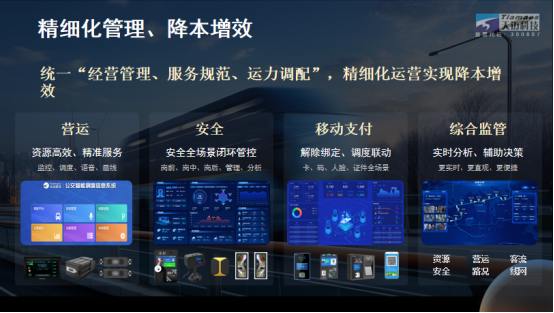 天迈科技建议公交企业通过信息化、数字化的手段来提高企业内部的精细管理能力,实现降本增效。智能化的公交运营体系,解决资源利用率低、运力运量不匹配问题;打造安全管理闭环,强化安全管控能力;建立调度联动的移动支付,实现网络化运营;建设高效的监管,辅助企业快速决策。通过上述措施,有效提高企业精细化运营水平,助力企业可持续高质量发展。
