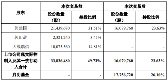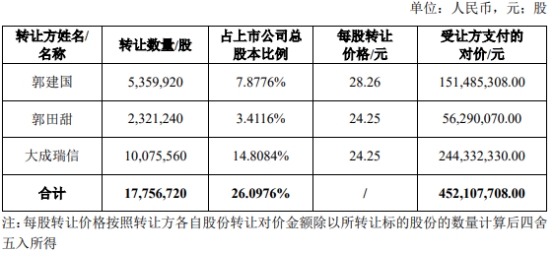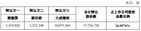 上述股份转让方为郭建国、郭田甜和大成瑞信。郭建国之配偶田淑芬持有大成瑞信62.5613%合伙份额,郭田甜为郭建国的女儿,根据中国证监会《上市公司收购管理办法》的规定,郭建国、田淑芬、郭田甜、大成瑞信构成一致行动关系。
