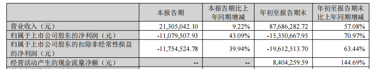 天迈科技(300807.SZ)2025年三季度报告显示,2025年前三季,公司实现营业收入8768.63万元,同比增长57.08%;归属于上市公司股东的净利润-1535.07万元,同比增长70.97%;归属于上市公司股东的扣除非经常性损益的净利润-1961.25万元,同比增长63.44%;经营活动产生的现金流量净额为840.43万元,同比增长144.69%。