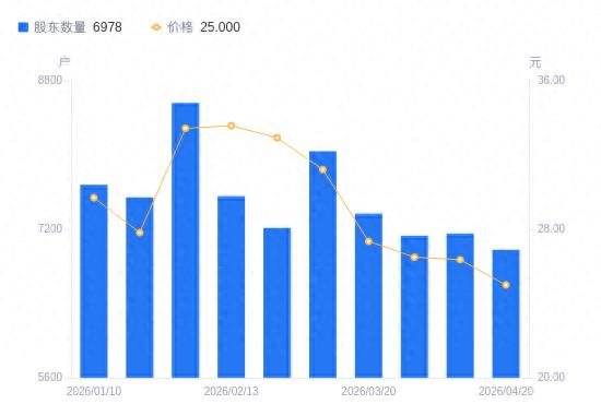 4月22日消息,数据显示,截至2026年4月20日,久量股份A股股东总户数为6978户,较上期(2026年4月10日)减少174户,降幅2.43%。公司最新A股总股本为1.6亿股,其中流通A股1.19亿股,户均持有流通A股数量为1.7万股,较上期增加414.54股,增幅2.49%;户均持流通A股市值42.6万元,较上期减少1.22万元,降幅2.79%。