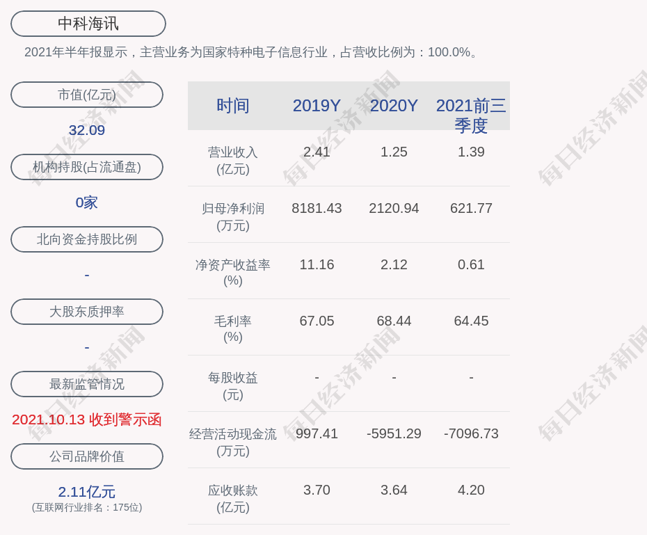 2021年半年报显示,中科海讯的主营业务为国家特种电子信息行业,占营收比例为:100.0%。
