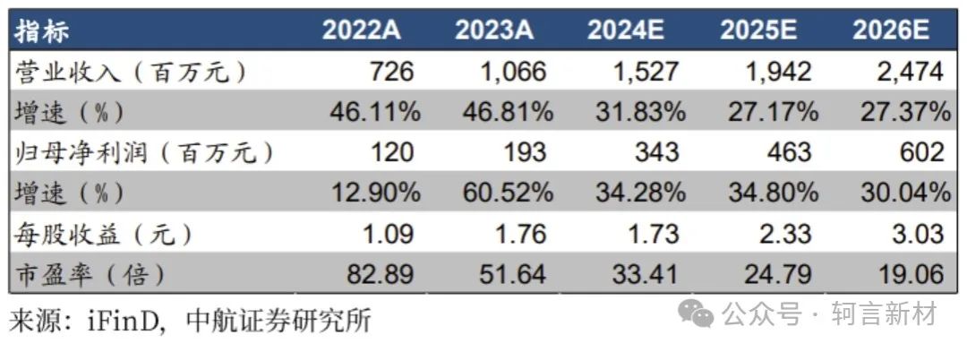 公司主业磁粉芯业务立足于新能源行业,通过着力延伸布局算力建设上游芯片电感环节,与全球领先的GPU芯片厂商形成业务绑定,进一步巩固了其“金属软磁材料及应用专家”的行业地位,第二增长曲线已然开启,有望拥抱人工智能时代的高速发展窗口。我们预计公司2024-2026年实现营业收入分别为15.3/ 19.4/ 24.7亿元,同比增长32%/ 27%/ 27%,实现归母净利润分别为3.43/ 4.63/ 6.02亿元,同比增长34%/ 35%/ 30%,对应PE 33X/ 25X/ 19X。维持“买入”评级。