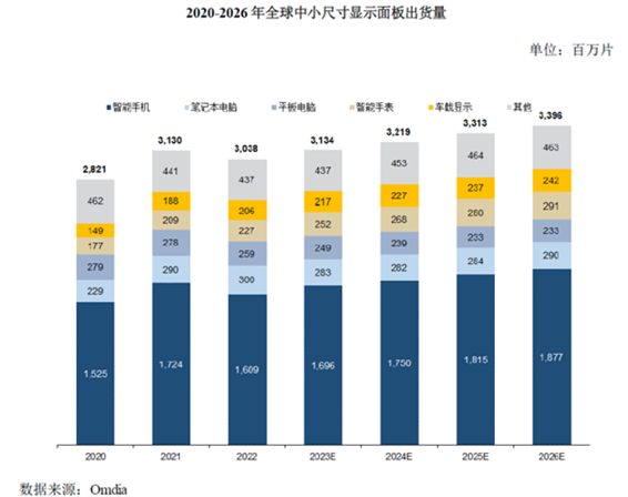 伴随消费电子需求收缩而来的是全球及国内面板产业规模增速的放缓。Omdia预测数据表明,未来几年全球中小尺寸面板出货量仍将趋于平稳。