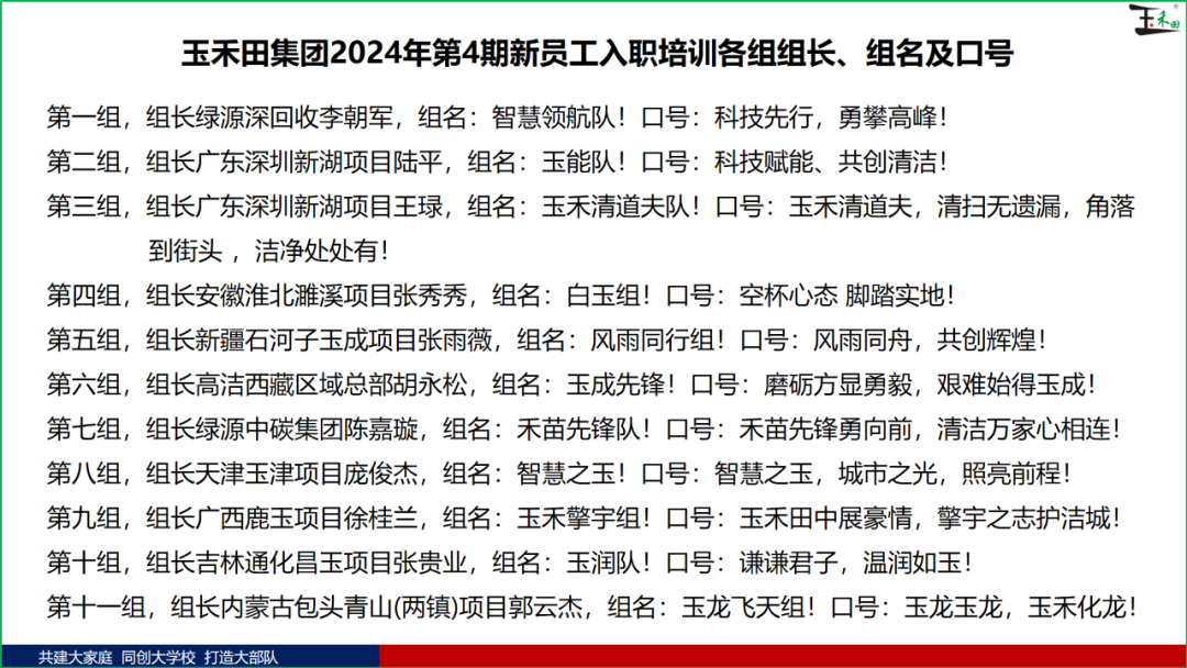 本次培训围绕“融入?交流?起航”展开,包含“印象玉禾田、融入玉禾田、探索玉禾田和启航奋斗”四个模块。培训形式多样,包括授课、《董事长历年讲话》视频观摩学习、考试、团队PK评优和分享,旨在使新员工快速胜任岗位要求,提升工作效能。