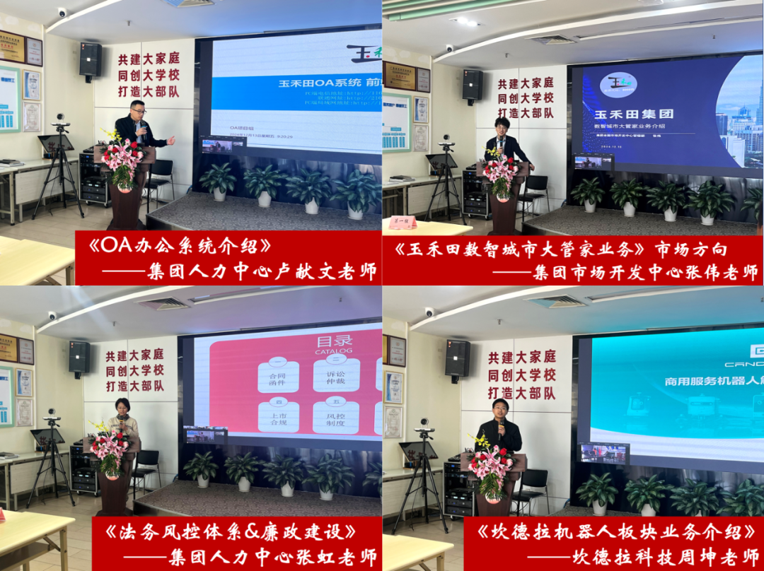 接下来进入“融入玉禾田”和“探索玉禾田”两个模块。“融入玉禾田”模块让学员逐步了解企业文化、公司规章制度、办公操作、品牌文化、公司法务和廉政合规等应知应会内容。“探索玉禾田”模块让学员深入学习数智城市大管家、市场开发、物业清洁、垃圾分类、灯光照明、智慧停车以及坎德拉机器人的业务介绍(讲师及讲授课程如下)。