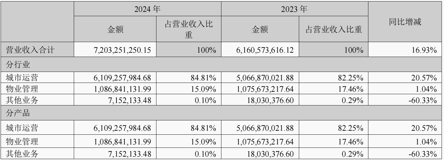 玉禾田2024年年报显示,公司的主营业务体系由城市运营与物业管理两大战略板块构成,致力于为政府机构及企业客户提供全场景、多维度的城市综合服务解决方案。公司去年全年收入72.03亿元,同比增长16.93%,归母净利润5.75亿元,同比增长10.40%。其中,城市运营板块的营业收入为61.09亿元,占总收入的84.81%,增速达20.57%;物业管理板块收入为10.87亿元,占比为15.09%,同比增长了1.04%。