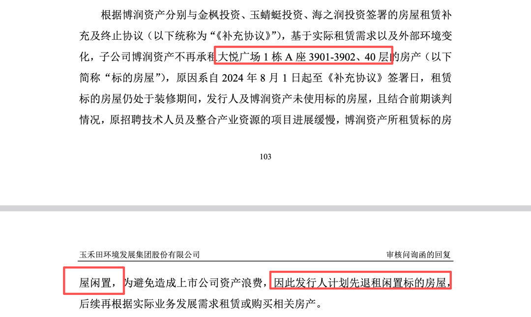 在交易所的问询下,玉禾田·300815最终在回复中承认:自2024年8月1日起至补充协议签署日,租赁的标的房屋(如3901-3902、40层)一直处于“闲置”状态,理由改口为“原招聘技术人员及整合产业资源的项目进展缓慢”,并以此为由决定退租部分闲置房屋。这一“遇问询即退租”的应激反应,或证实了最初所谓“机器人团队扩充急需空间”或是彻头彻尾的借口,或坐实了该关联交易在初始决策阶段就缺乏商业实质,或是一起典型的利用上市公司资金为大股东关联资产“买单”的利益输送行为。