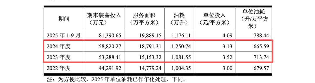 针对2025年指标的畸高,玉禾田·300815解释称:“主要系当年新增的兰州市城关区城市管理一体化项目等大型市政环卫项目所致,该项目单位作业面积的装备投入为14.80元/平方米、单位油耗为2,260.17升/万平方米,由于其初始投入及服务难度较大,拉高了单位作业面积的装备投入及油耗。”