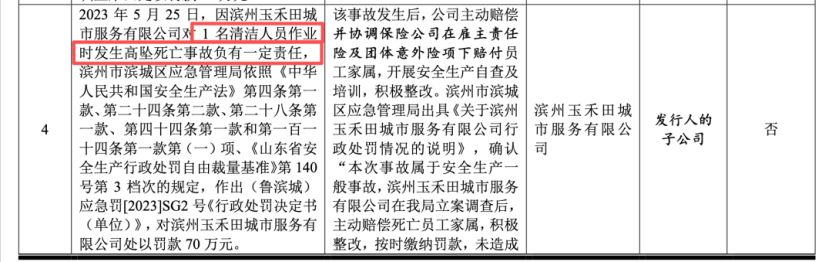 2023年,子公司滨州玉禾田城市服务有限公司清洁人员在作业时发生安全生产事故,被应急管理部门处以顶格的70万元罚款。
