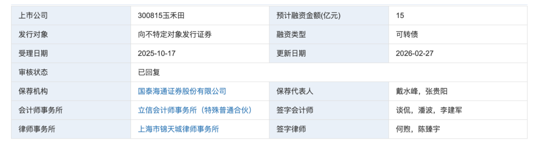 玉禾田·300815保荐机构为国泰海通证券股份有限公司保荐代表人戴水峰,张贵阳、会计师事务所立信会计师事务所(特殊普通合伙)签字会计师谈侃,潘波,李建军、律师事务所上海市锦天城律师事务所签字律师何煦,陈臻宇。