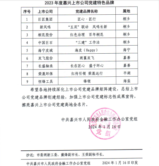 近日,市金融办公布了2023年度嘉兴市上市公司党建特色品牌“一企一品”评选结果,双飞集团“两翼双飞”党建品牌成功入选。这是继2022年以来,双飞集团连续2年入选嘉兴市上市公司党建特色品牌。