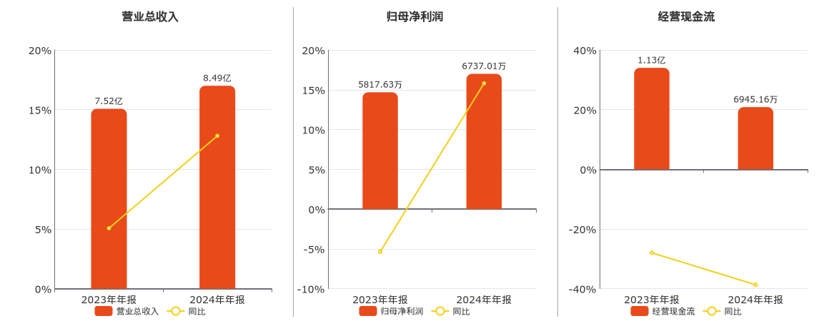 公司营业总收入为8.49亿元。归母净利润为6737.01万元。经营活动现金净流入为6945.16万元,较去年同报告期经营活动现金净流入减少4385.95万元,同比较去年同期下降38.71%。