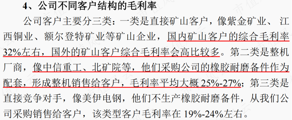 不同客户的销售毛利率存在明显差异,其中海外矿山客户综合毛利率相对较高。