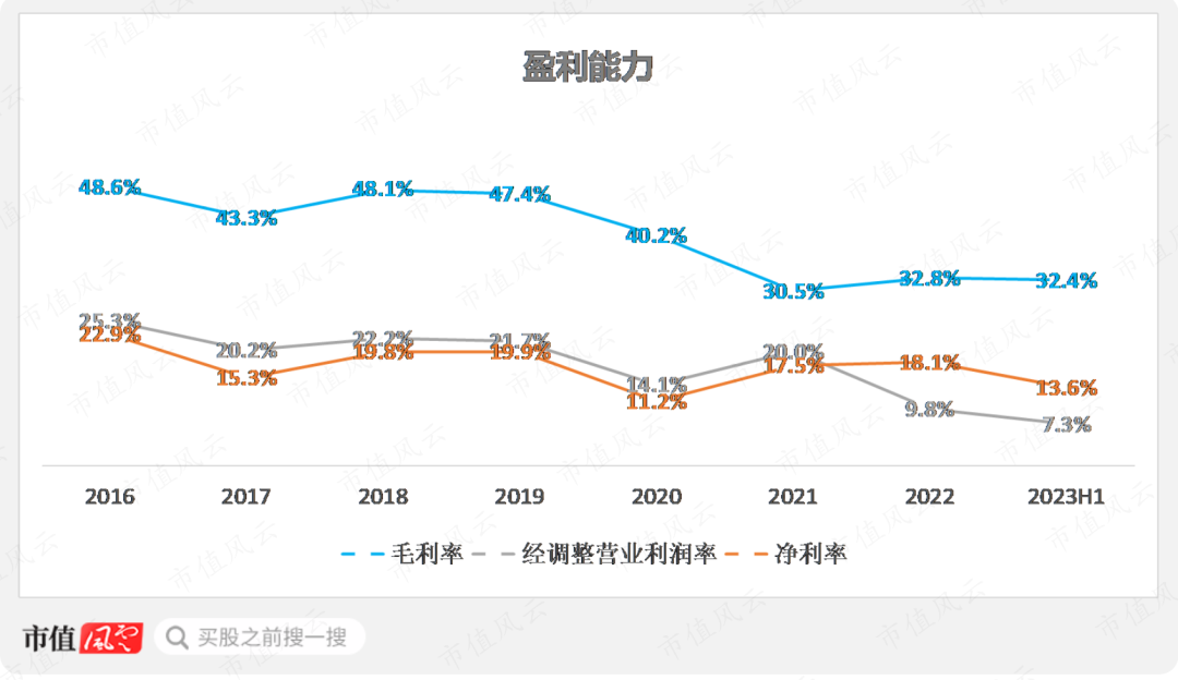 整体来看,公司综合毛利率大致呈下滑趋势,今年上半年为32.4%。