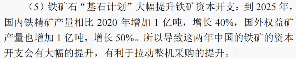 另外,按照铁矿石“基石计划”:到2025年,国内铁精矿产量相比2020年增加1亿吨,增长40%;海外权益矿产量也增加1亿吨,增长50%。这在一定程度也会提升相关企业资本开支。