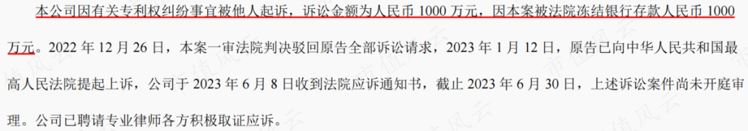 此前公司还因专利权事项被他人起诉,诉讼金额为1000万元,目前案件尚未终止。