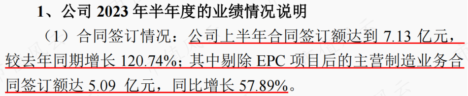 2023年上半年,合同签订额达7亿元,同比增长121%;剔除EPC项目后的主营制造业务合同签订额为5亿元,同比增长57.9%。