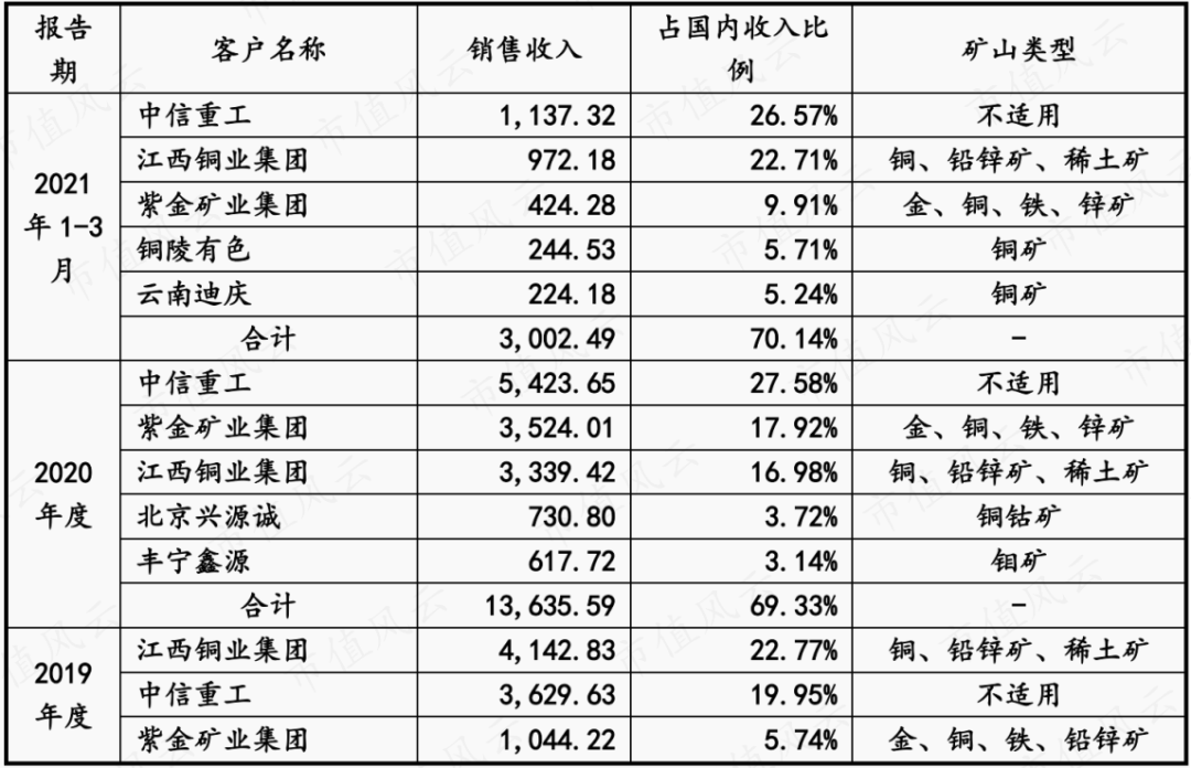 2018年至2020年,江铜集团、紫金矿业、中信重工均位列前五大客户,矿山类型多为金矿、铜矿及铁矿。