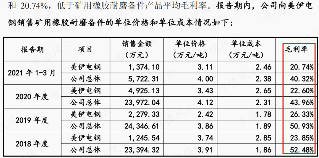 对美伊电钢销售的备件产品毛利率大幅低于总体水平,一方面是美伊电钢指定了相关供应商,另外公司希望通过美伊电钢推广橡胶磨机备件,售价也相对较低。