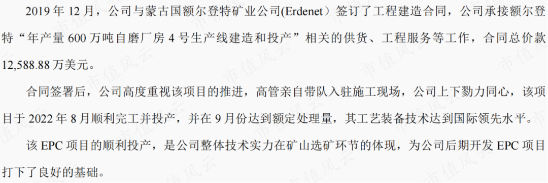 在制造业务之外,2019年公司还承接了蒙古国额尔登特矿业公司(Erdenet Mining Corporation,下称额尔登特)的工程建设项目(EPC项目)。