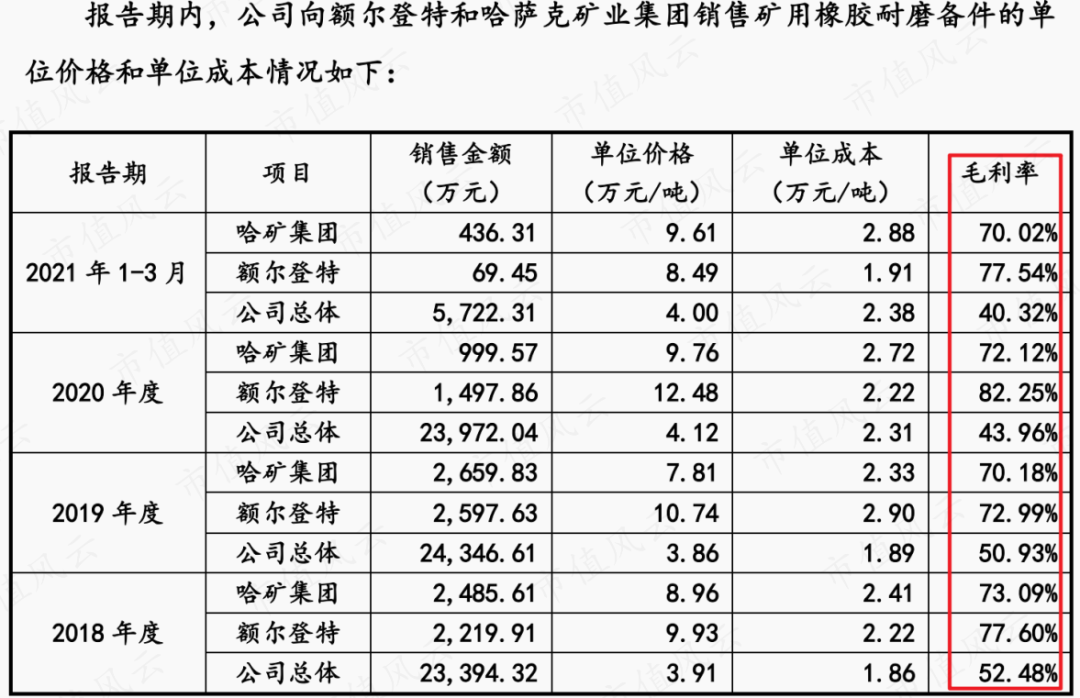 据披露,此前对额尔登特和哈萨克矿业销售的备件产品毛利率均超70%。