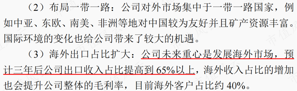从公司的发展战略来看,海外市场是未来的发展重心,预计三年后出口收入占比提高到65%以上。