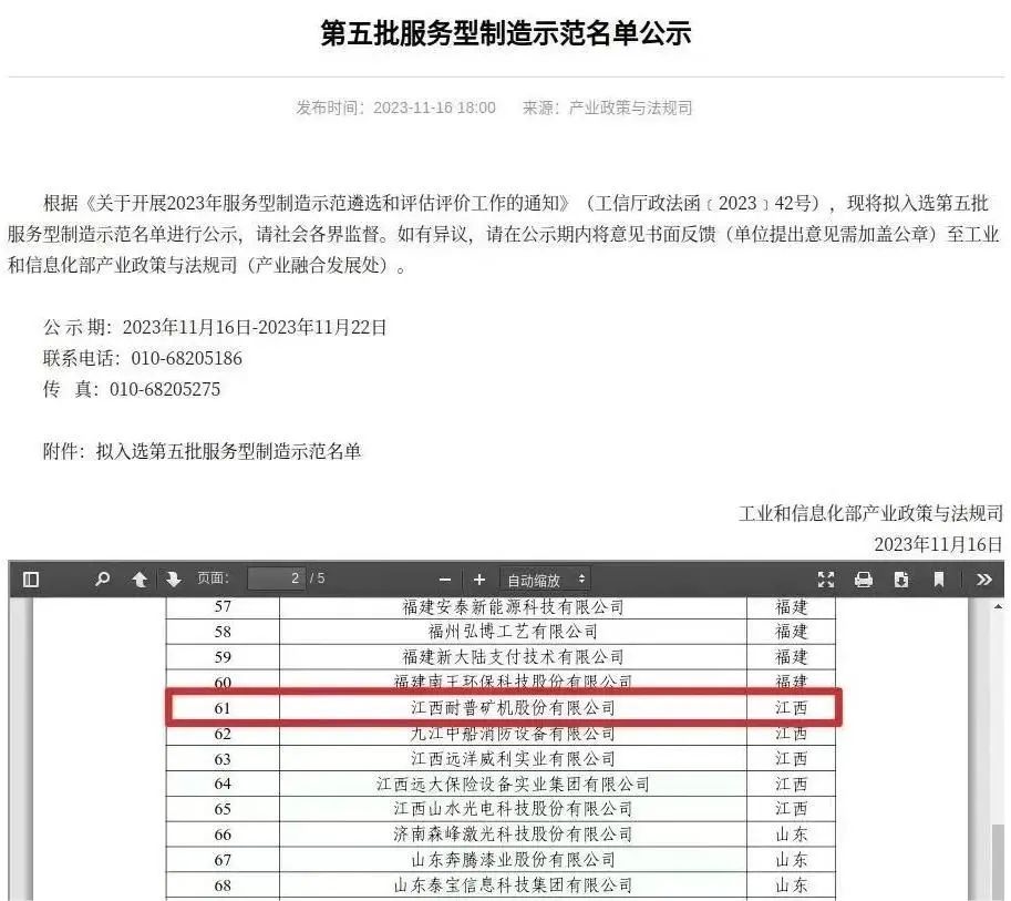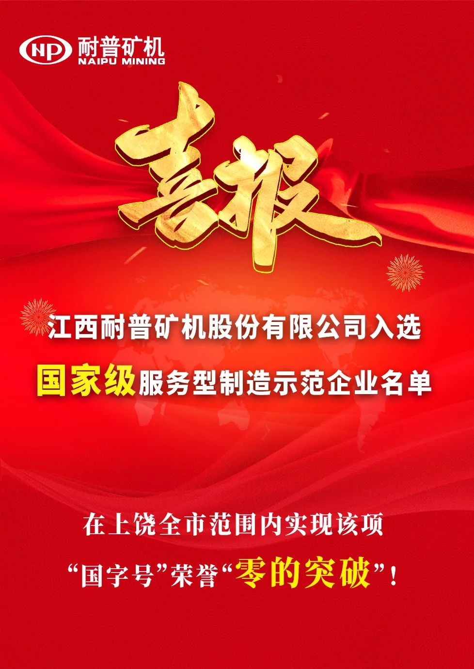 根据工信部官网公示,江西耐普矿机股份有限公司入选国家级服务型制造示范企业公示名单,在上饶全市范围内实现该项“国字号”荣誉“零的突破”!
