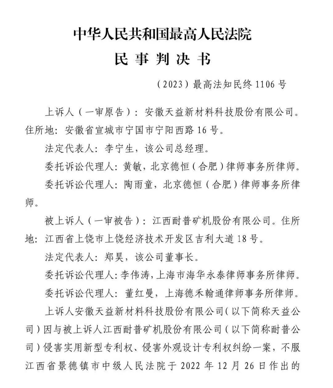 2023年12月11日,安徽天益新材料科技股份有限公司对耐普矿机股份有限公司发起侵犯专利权一案中,耐普矿机胜诉!