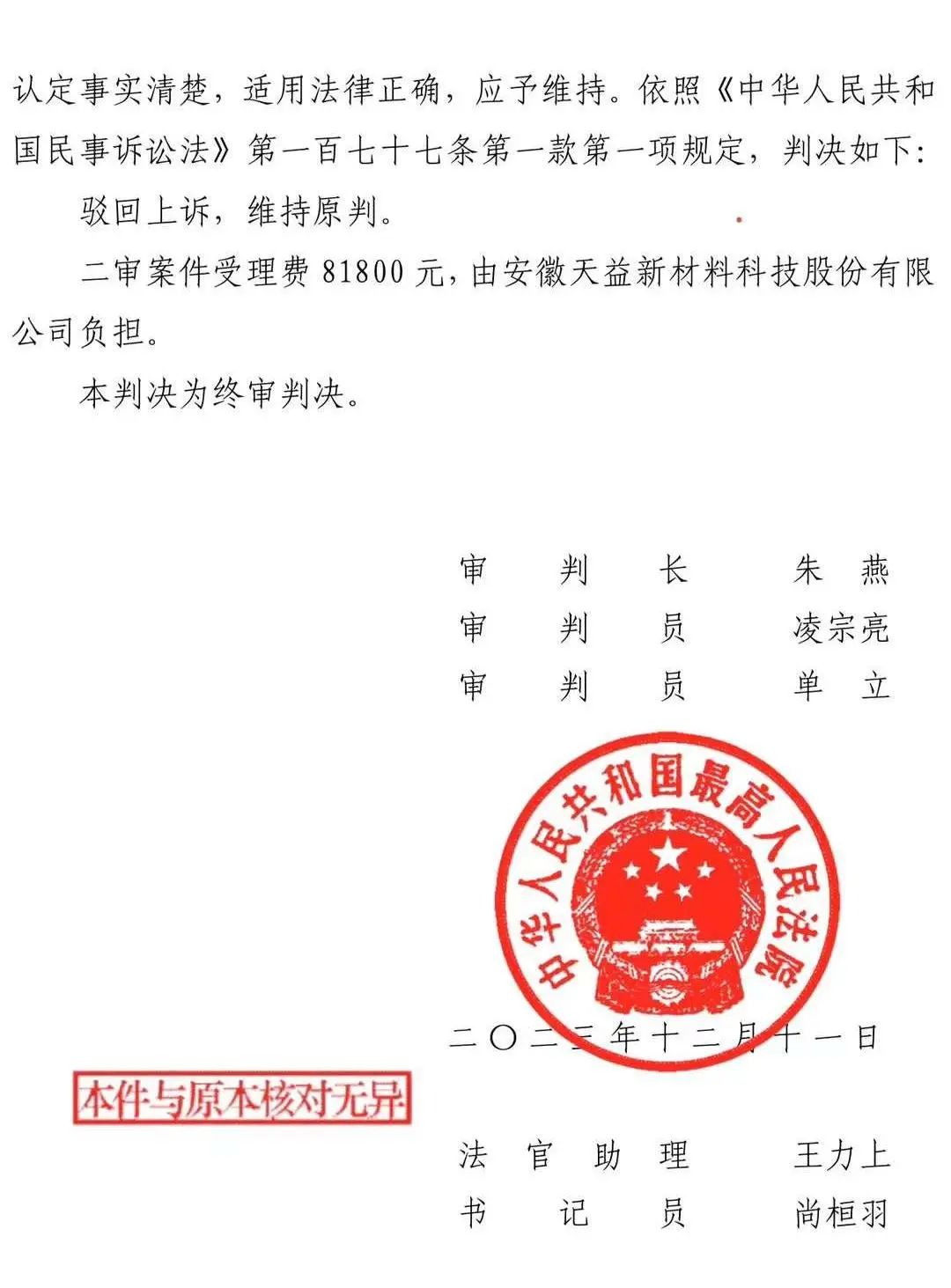 近日,耐普矿机收到中华人民共和国最高人民法院的终审判决:驳回安徽天益新材料科技股份有限公司的上诉请求,维持原判。