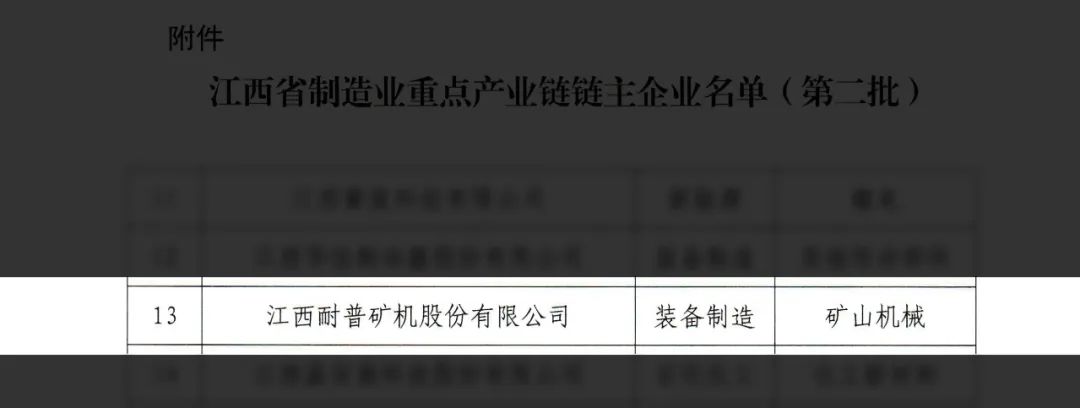 近日,2024年江西省制造业重点产业链第二批“链主”企业名单发布,耐普矿机获评全省“装备制造-矿山机械”产业链链主,是上饶市唯一一家上榜企业。