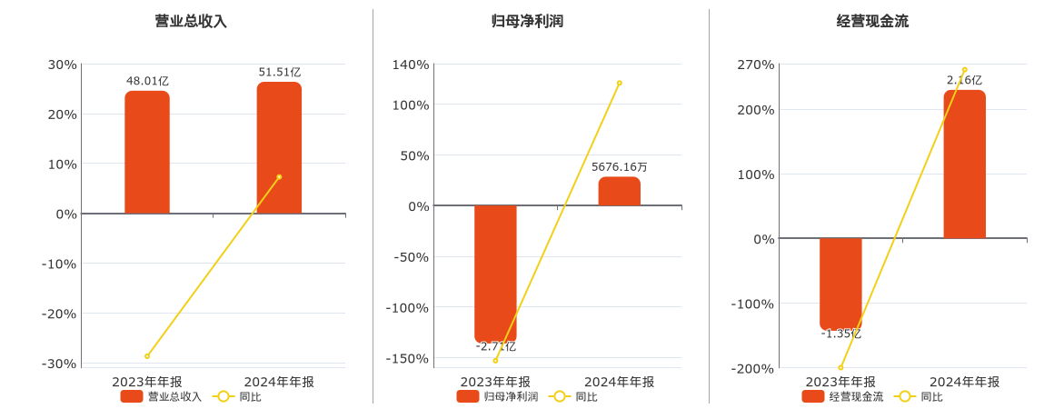 公司营业总收入为51.51亿元。归母净利润为5676.16万元。经营活动现金净流入为2.16亿元。