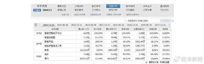 截至2023年12月31日,按行业来看,智能控制电子行业营业收入8.67亿,收入比例为100%。