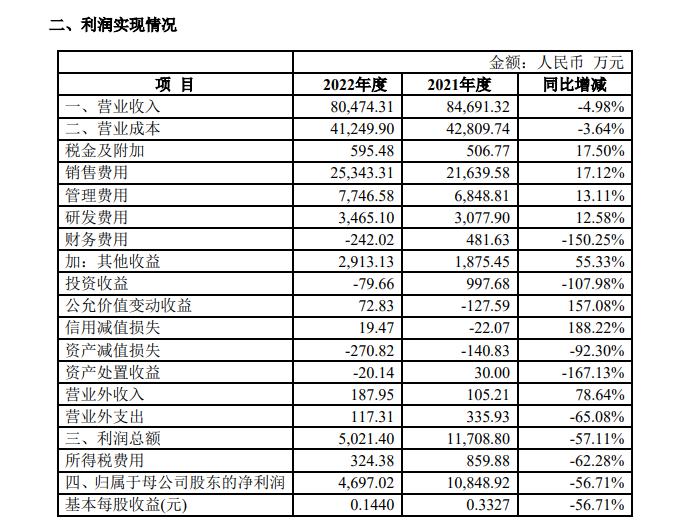 根据北鼎股份(300824)发布的 2022 年度报告,公司实现营业收入 80,474.31 万元,同比下滑了 4.98%。对此北鼎股份在年报中表示:全球政治经济环境不断震荡,突发事件持续加速演变,对公司生产经营带来了较大影响。