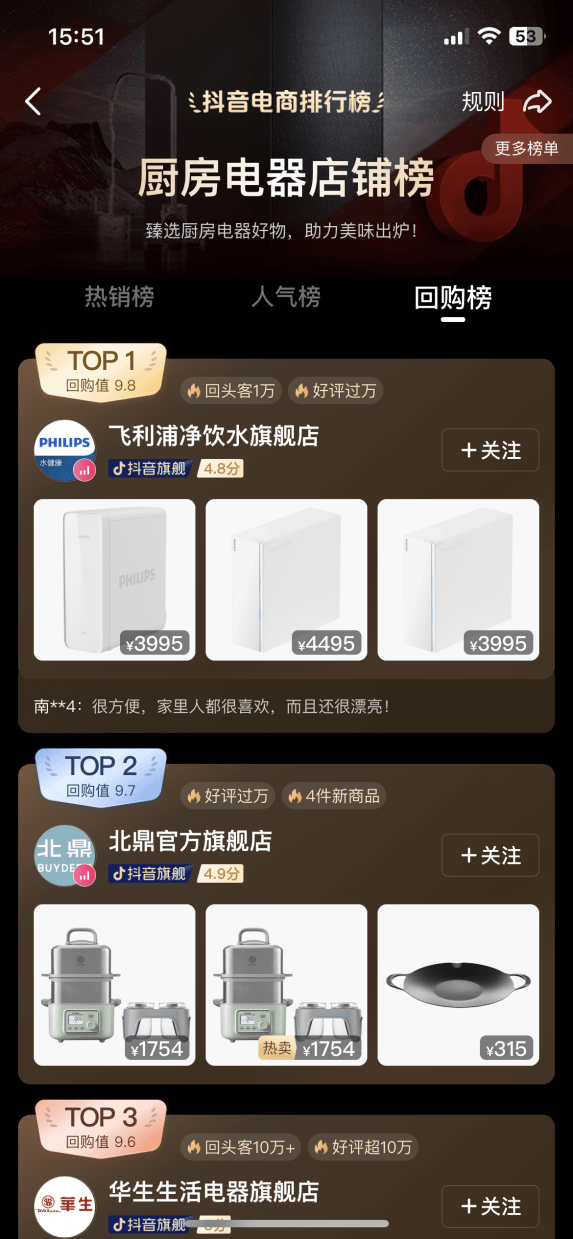 对应线上购物以及电商渠道,也已经有较为成熟的模式。近年来,持续通过短视频引流,在抖音、小红书等电商平台上,构建了忠实且具有购买力的粉丝群,还在今年上半年获得了抖音电商排行榜中回购榜第二名的殊荣。