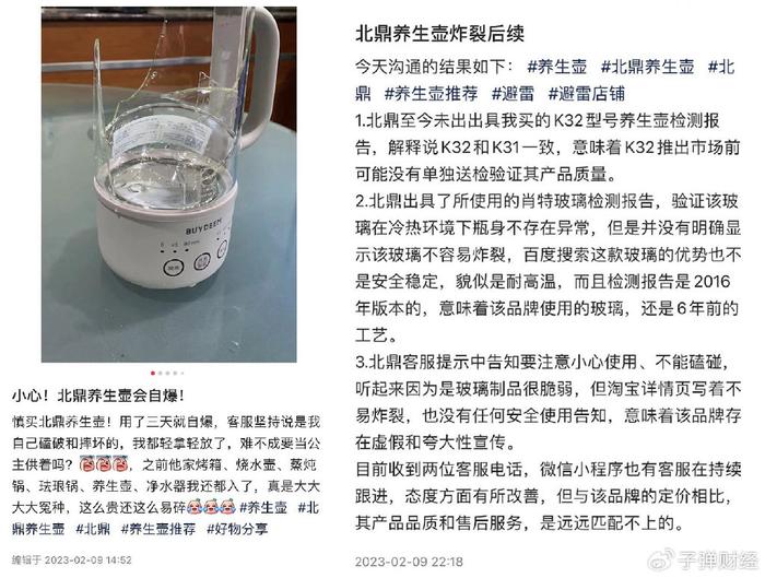 今年2月份,有网友在小红书上爆料北鼎的养生壶发生了自爆,该网友称他发帖后,客服曾联系他可以重新寄送一个,让该网友删帖,不过该网友明确表示,不需要新的壶,要求北鼎方面出具产品安全检测报告。