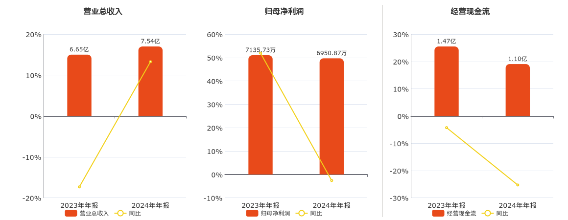公司营业总收入为7.54亿元。归母净利润为6950.87万元,较去年同报告期归母净利润减少184.86万元,同比较去年同期下降2.59%。经营活动现金净流入为1.10亿元,较去年同报告期经营活动现金净流入减少3724.99万元,同比较去年同期下降25.29%。