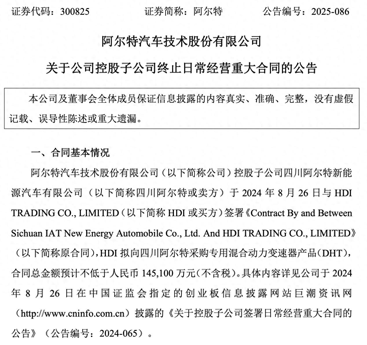 公告显示,公司控股子公司四川 阿尔特 新能源汽车有限公司(简称四川 阿尔特 或卖方)于2024年8月26日与HDITRADING CO.,LIMITED(简称HDI或买方)签署《Contract By and BetweenSichuan IAT New Energy Automobile Co.,Ltd.And HDI TRADING CO.,LIMITED》,HDI拟向四川 阿尔特 采购专用混合动力变速器产品(DHT),合同总金额预计不低于14.51亿元(不含税)。