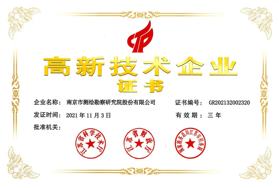 近日,公司荣获由江苏省科学技术厅、江苏省财政厅、国家税务总局江苏省税务局联合颁发的高新技术企业证书。