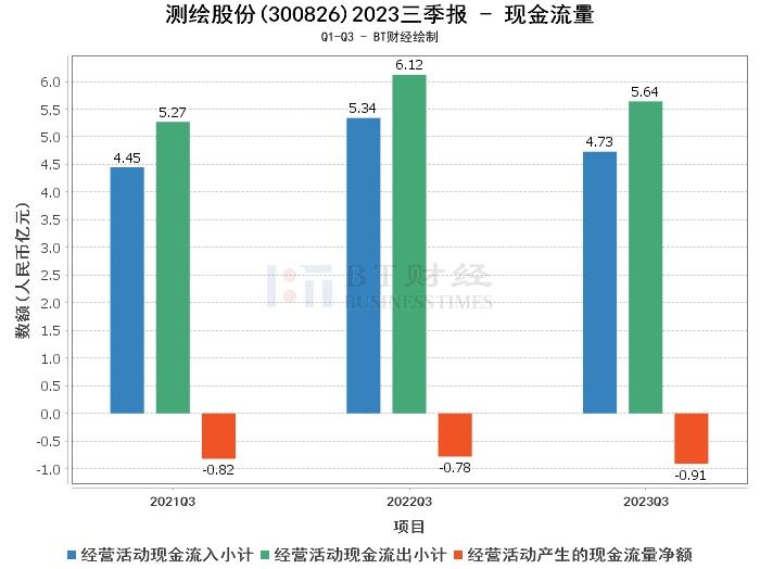 在现金流量方面,测绘股份2023年三季度的经营活动现金流入小计为4.73亿元,相比上年同期的5.34亿元下滑了11.42%。经营活动现金流出小计为5.64亿元,相比上年同期的6.12亿元下滑了7.84%。