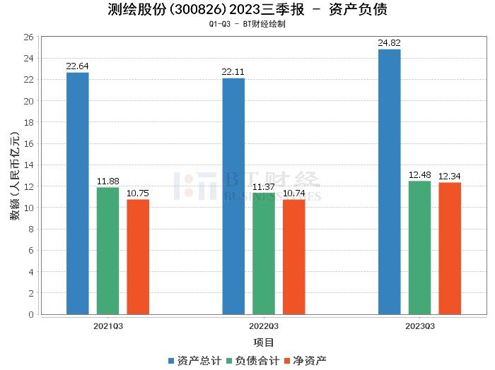 在资产负债方面,测绘股份2023年三季度的资产总计达到了24.82亿元,相比上年度末的22.17亿元增长了11.94%。负债合计为12.48亿元,相比上年度末的10.94亿元增长了14.07%。净资产为12.34亿元,相比上年度末的11.23亿元增长了9.88%。资产负债率为50.27%,较上年度末的49.36%有所上升。这些变化主要是由于公司在2023年3月公开发行可转债,募集资金到账所致。
