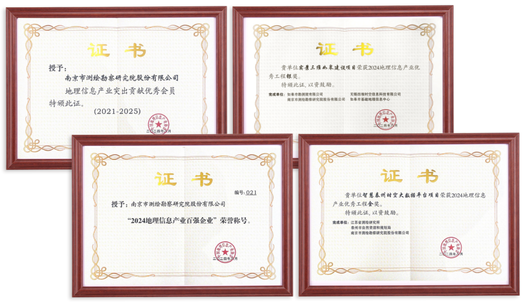 公司参评的“智慧泰州时空大数据平台项目”、“潜山市房地一体农村宅基地和集体建设用地使用权确权登记颁证项目”、“南京地铁1/4线路保护监测数据采集维保(一类)项目”、“实景三维如皋建设项目”获得了2024地理信息产业优秀工程奖1金3银的优异成绩。