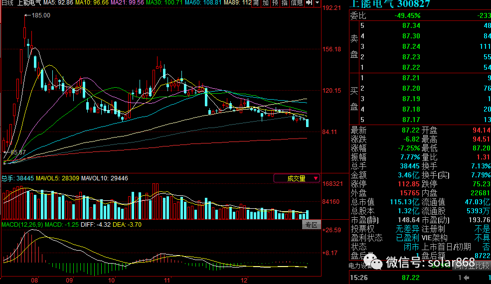 12月24日,光伏板块全线走低,上能电气(300827)收盘大跌7.25%,创出4个月新低87.20元。