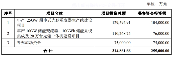 其中,10.4亿元拟用于年产25GW组串式光伏逆变器产业化建设项目、7.6亿元拟用于年产10GW储能变流器、10GWh储能系统集成及20万台光储一体机建设项目、7.5亿元拟用于补充流动资金。
