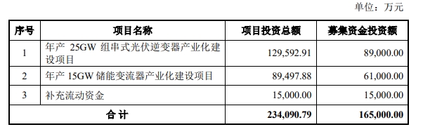 其中,8.9亿元拟用于年产25GW组串式光伏逆变器产业化建设项目、6.1亿元拟用于年产15GW储能变流器产业化建设项目、1.5亿元拟用于补充流动资金。