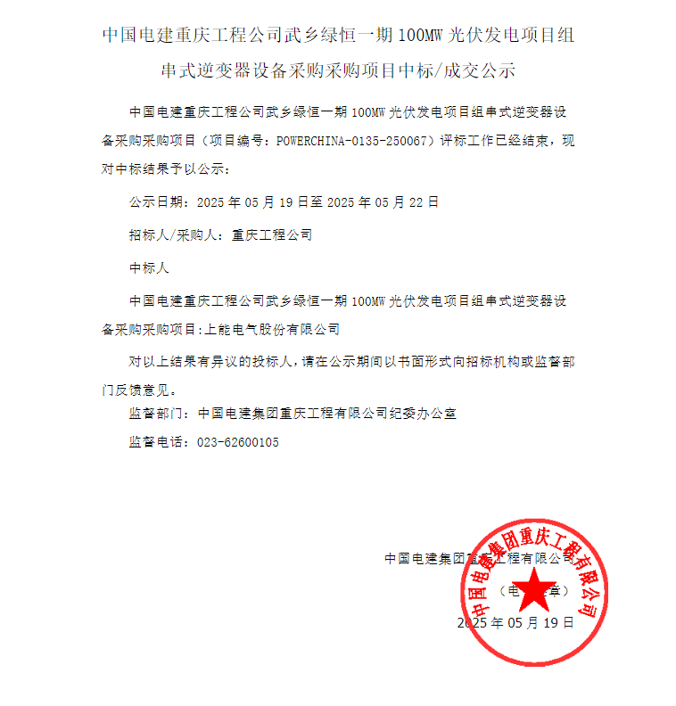 5月19日,中国电建重庆工程公司武乡绿恒一期100MW光伏发电项目组串式逆变器设备采购采购项目成交公示。
