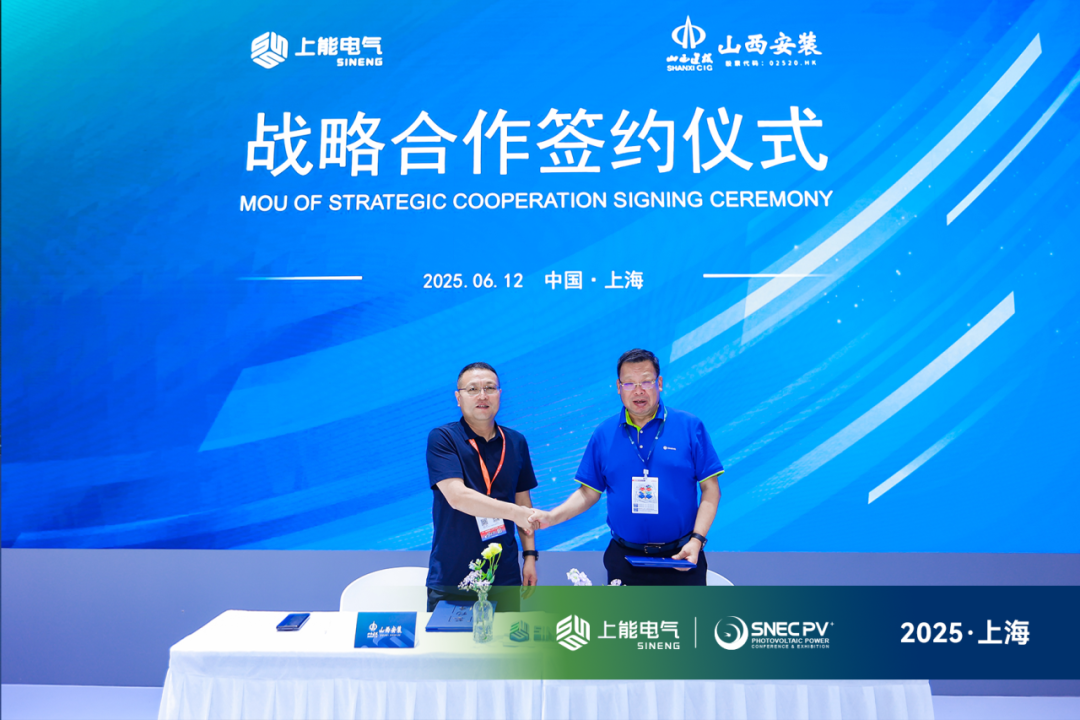 2025 SNEC次日,上能电气股份有限公司与山西省安装集团股份有限公司(以下简称“山西安装集团”)在多年合作的基础上,正式签订战略合作协议。山西安装集团董事长任锐和上能电气董事长吴强出席本次签约仪式,共同见证了这一里程碑时刻。