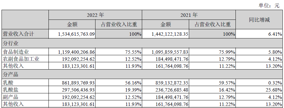 分业务来看,公司2022年乳酸业务营收8.61亿元,占比56.16%,同比增长0.32%,为主要营收来源;乳酸盐业务2.98亿元,占比19.39%,同比增长25.68%,增速明显。